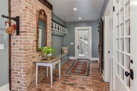 Brick Entryway Ideas. This colorful farmhouse porch features a bright yellow door and contrasting concrete steps. Brick entryway with wall hooks enhance the functionality of your hallway by adding wall hooks that will.