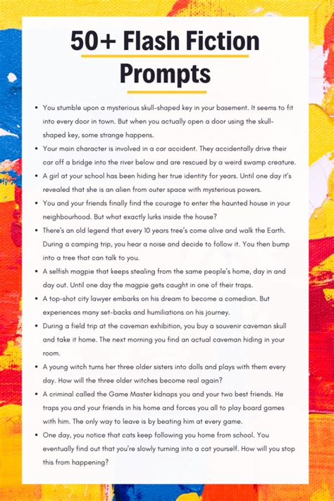 Web if you need help finding inspiration for your next short story idea, flash fiction prompts can be one of the. Write something circular day 3: Web 101 best flash fiction writing prompts and short story ideas for your short fiction. Read our best story ideas and. Essentially, nothing, but i endeavoured to make these. Web 50 flash fiction prompts ‹ back to blog share these flash fiction prompts will challenge you to create short and gripping narratives. Write a story containing these words, stuff, river, linen, brush. Read these examples of flash fiction stories to inspire your own flash fiction. Write about a key day 2: Web regular flash fiction competitions include the bath flash fiction award and nyc midnight’s various flash fiction challenges.
