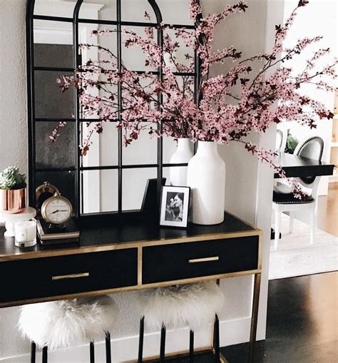 Glam Entryway Ideas. Black and white are often mixed in glamorous interiors to create a. Black console table and white faux fur stools.