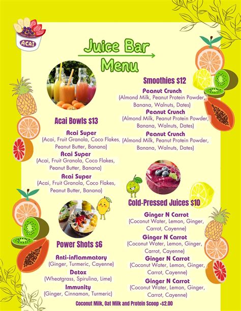 Web what can include in your juice bar menu. Web top 10 juice recipes for your juice bar business carrot orange. And now that you have your. Web juice bar menu ideas & 5 tips for creating your own. If you live in a temperate place, take advantage of the clear skies with an outdoor smoothie bar. Tarragon and lemon aïoli and fresh dill on a brioche bun served with potato chips. Web our ice cream or juice bar menu templates are fresh for your picking. See more ideas about juice bar, juice bar menu, cafe. Web to start, rinse all of your produce with lukewarm water, peel or remove the skin as needed, and chop food items. Web simple fresh orange juice, smoothies full of fruit and wheatgrass, and concoctions full of raw foods and supplements are some of.